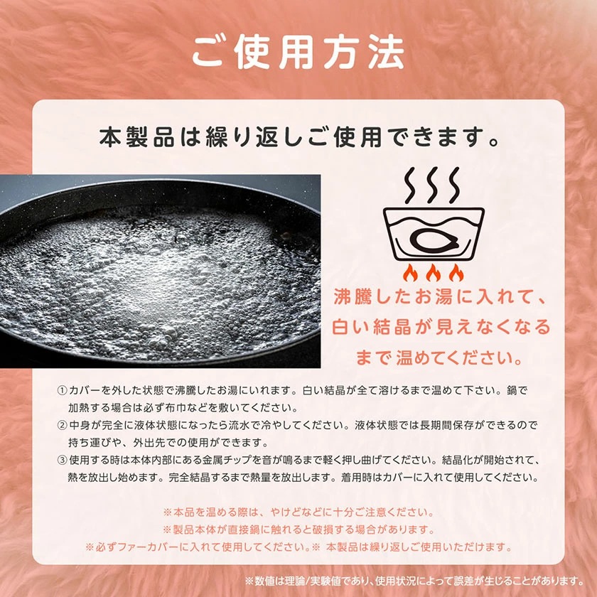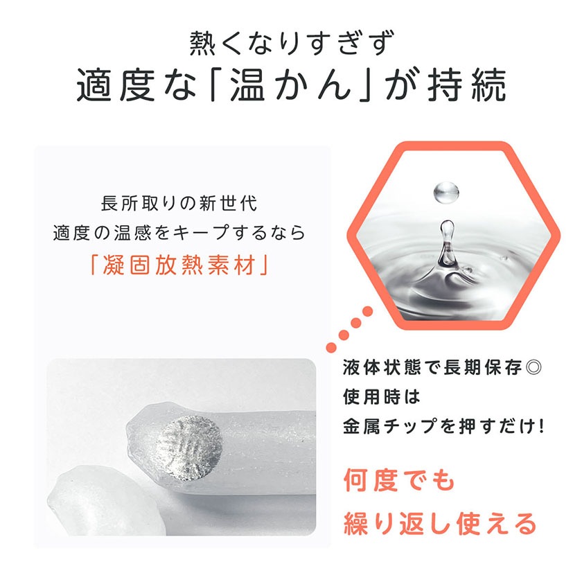 ・【恒温・繰り返し使える】蓄熱素材を使用、電気不要、過熱することもなく、さらに何回もくり返し使用できるから。より経済的、よりエコ的です!