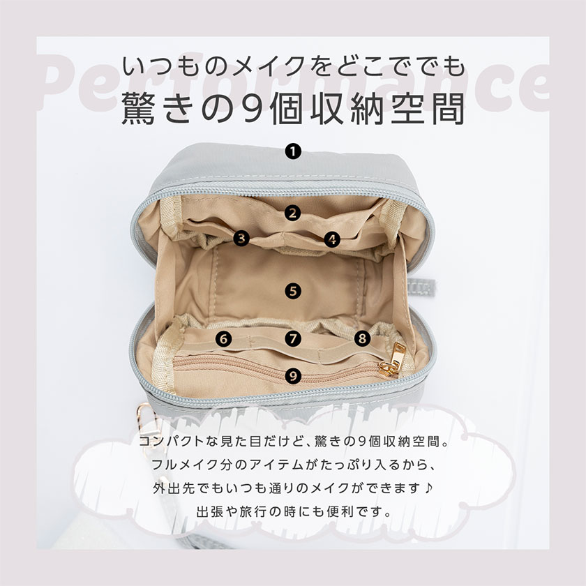 ・【驚きの9個収納空間】コンパクトな見た目だけど、驚きの9個収納空間。フルメイク分のアイテムがたっぷり入るから、外出先でもいつも通りのメイクができます♪