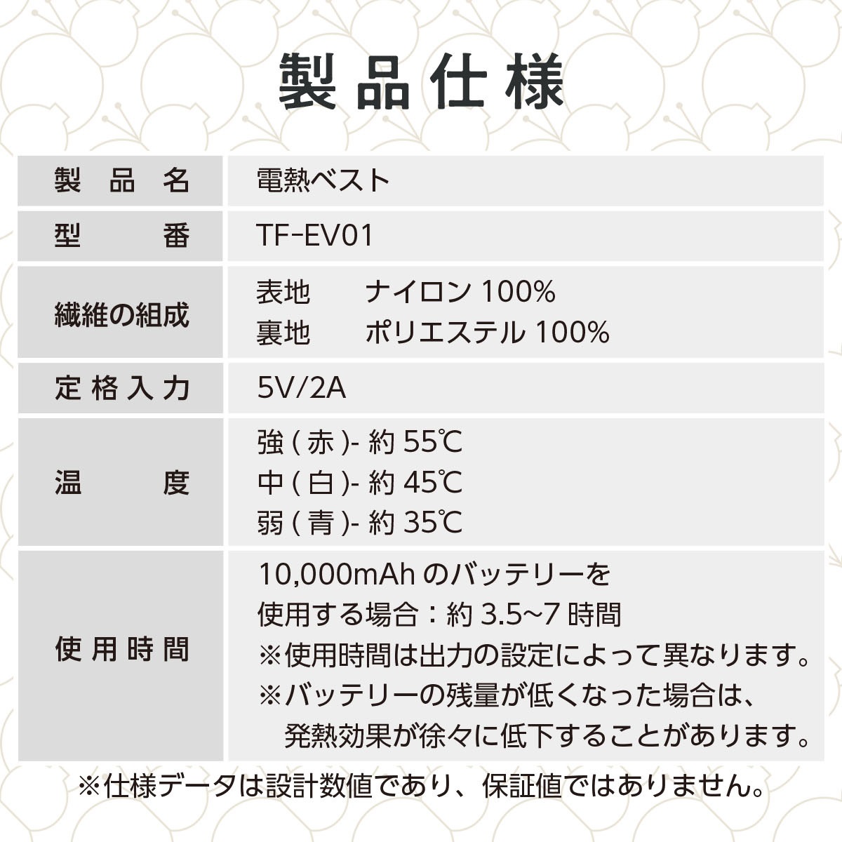 商品名称 電熱ベスト ブランド TOKAIZ 型番 TF-EV01 商品詳細 繊維の組成:表地-ナイロン100%、裏地-ポリエステル 100%