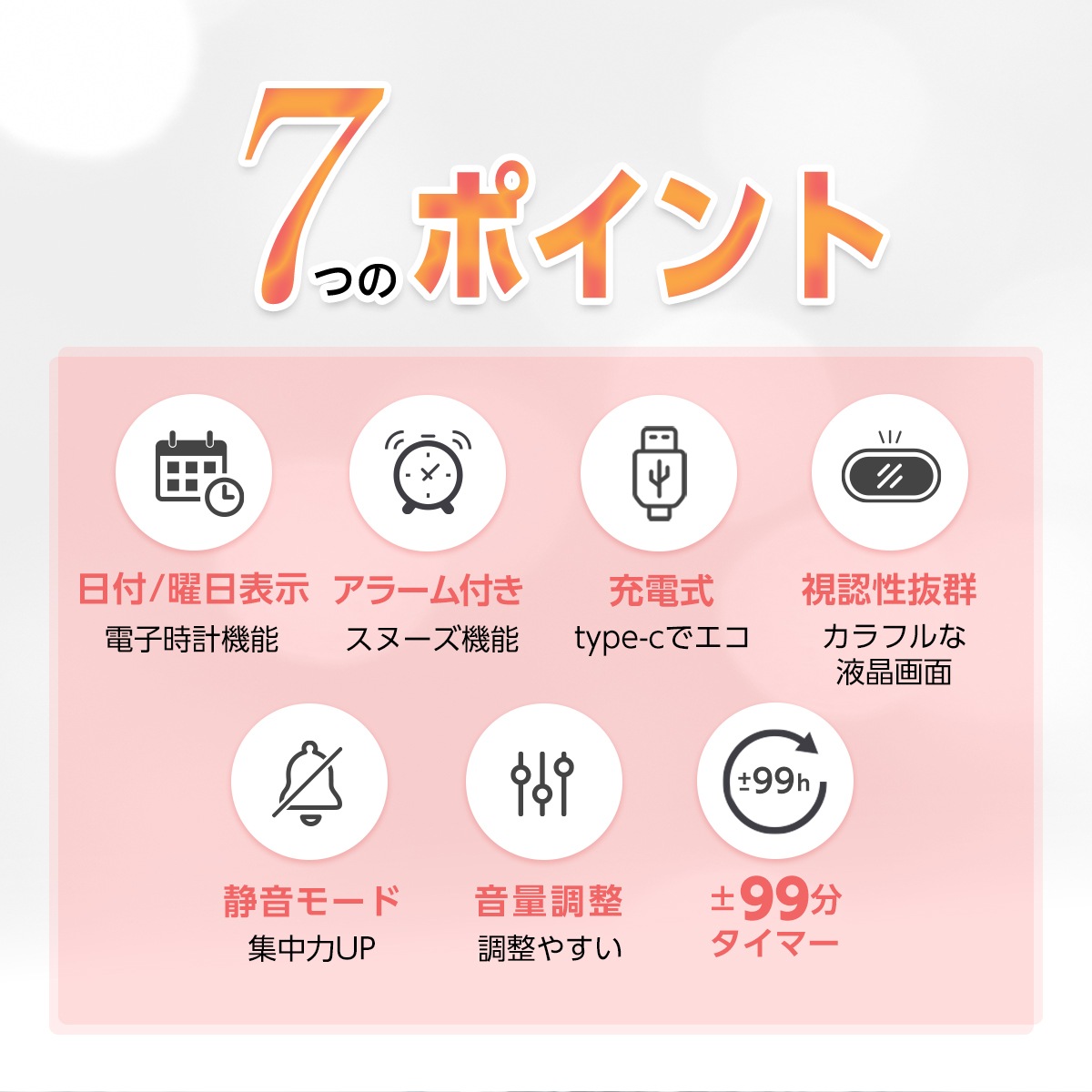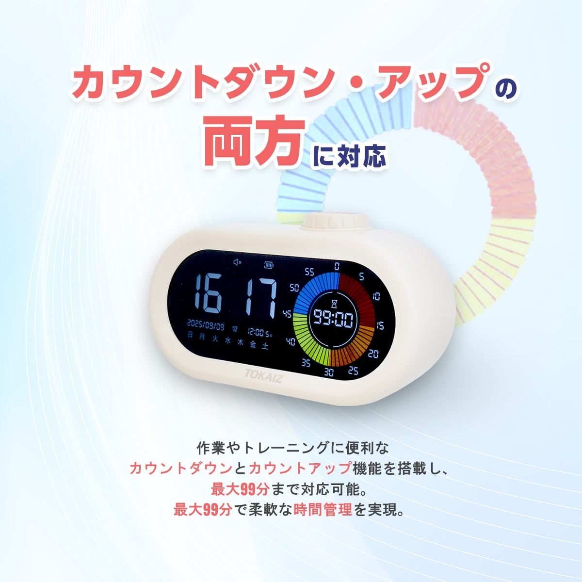 【多機能タイマー】 日付と曜日表示、最大99分のカウントダウン・カウントアップ機能で、あらゆるシーンに対応。