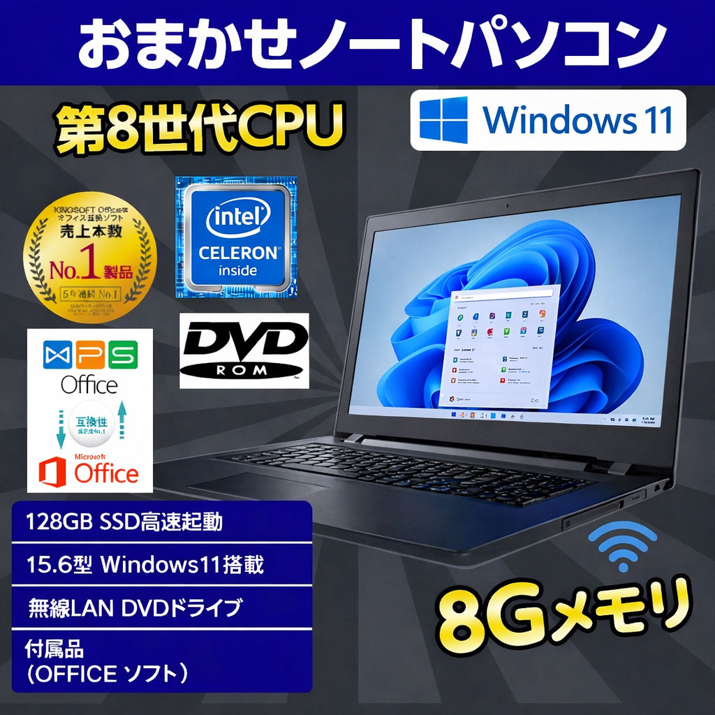 【お買い得なキャンペーン実施中!】第8世代CUP SSD 128GB搭載 中古ノートパソコン Windows11 中古パソコン おまかせパソコン 新型 Celeron メモリ 8GB 無線LAN Office付き
