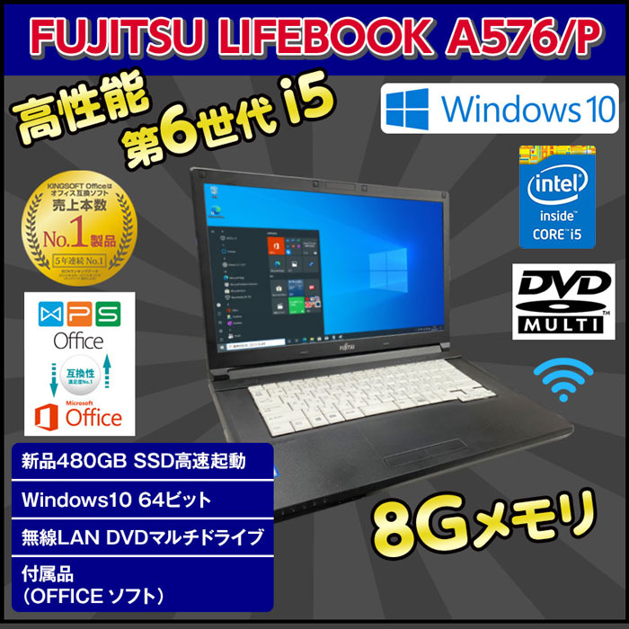 【お買い得なキャンペーン実施中!】 中古ノートパソコン Windows 10 中古パソコン 高性能 第6世代 Corei5 6300U 2.4GHz FUJITSU LIFEBOOK A576/P 8GB 新品 SSD 480GB HDMI付き 無線 Wifi DVDマルチドライブ Windows10 64ビット OFFICE付 送料無料