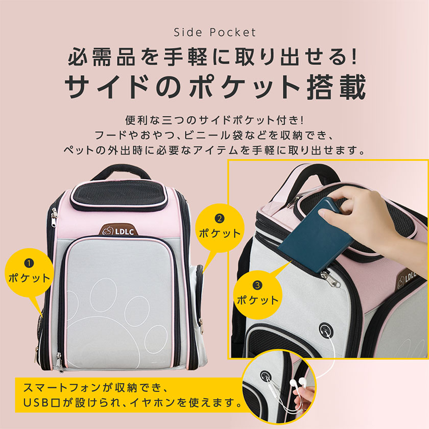 ・【サイドポケット搭載】便利な三つのサイドポケット付き!フードやおやつ、ビニール袋などを収納でき、ペットの外出時に必要なアイテムを手軽に取り出せます。