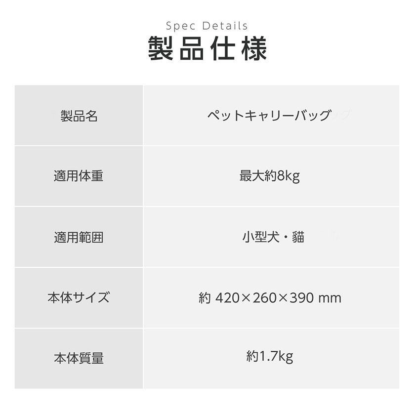 商品名称 ペットキャリーバッグ 商品詳細 適用体重:約8kg