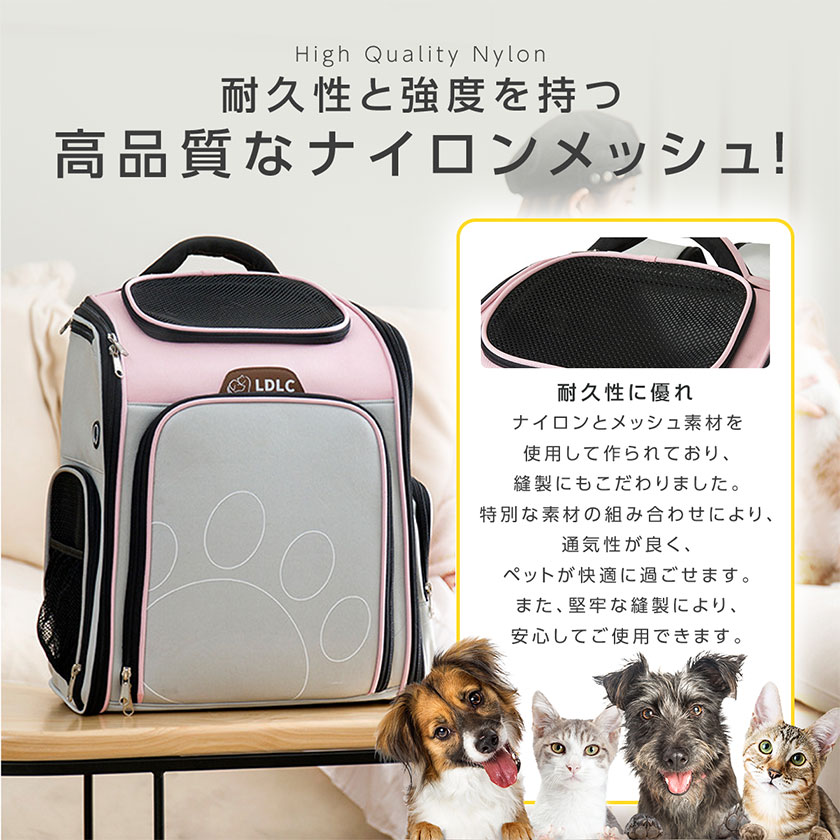 - ・【高品質なナイロンメッシュ】ナイロンとメッシュ素材を使用して作られており、縫製にもこだわりました。特別な素材の組み合わせにより、通気性が良く、ペットが快適に過ごせます。