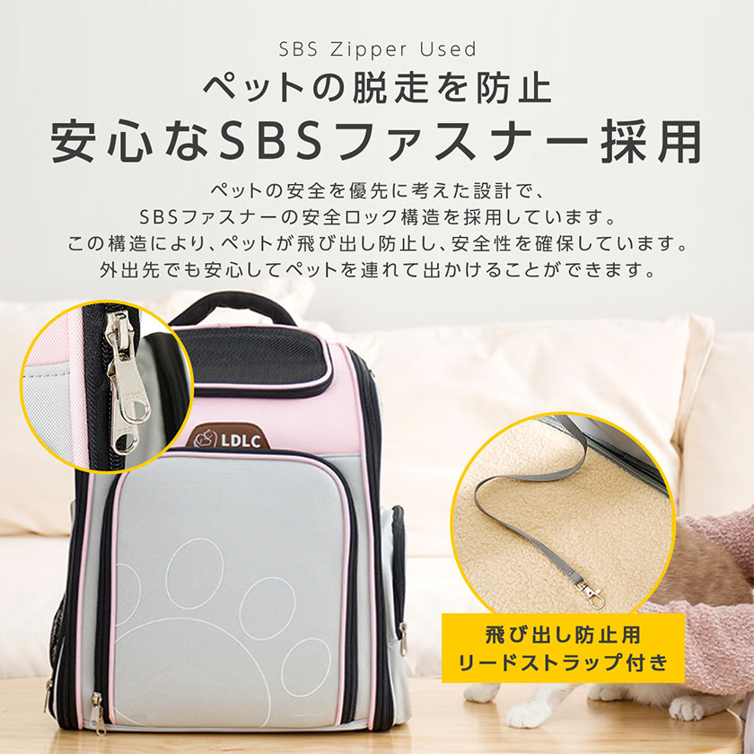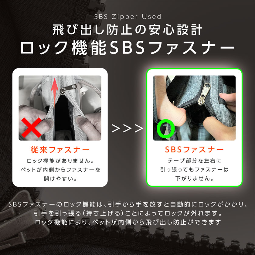 ・【安心なSBSファスナー採用】ペットの安全を優先に考えた設計で、SBSファスナーの安全ロック構造を採用しています。この構造により、ペットが飛び出し防止し、安全性を確保しています。