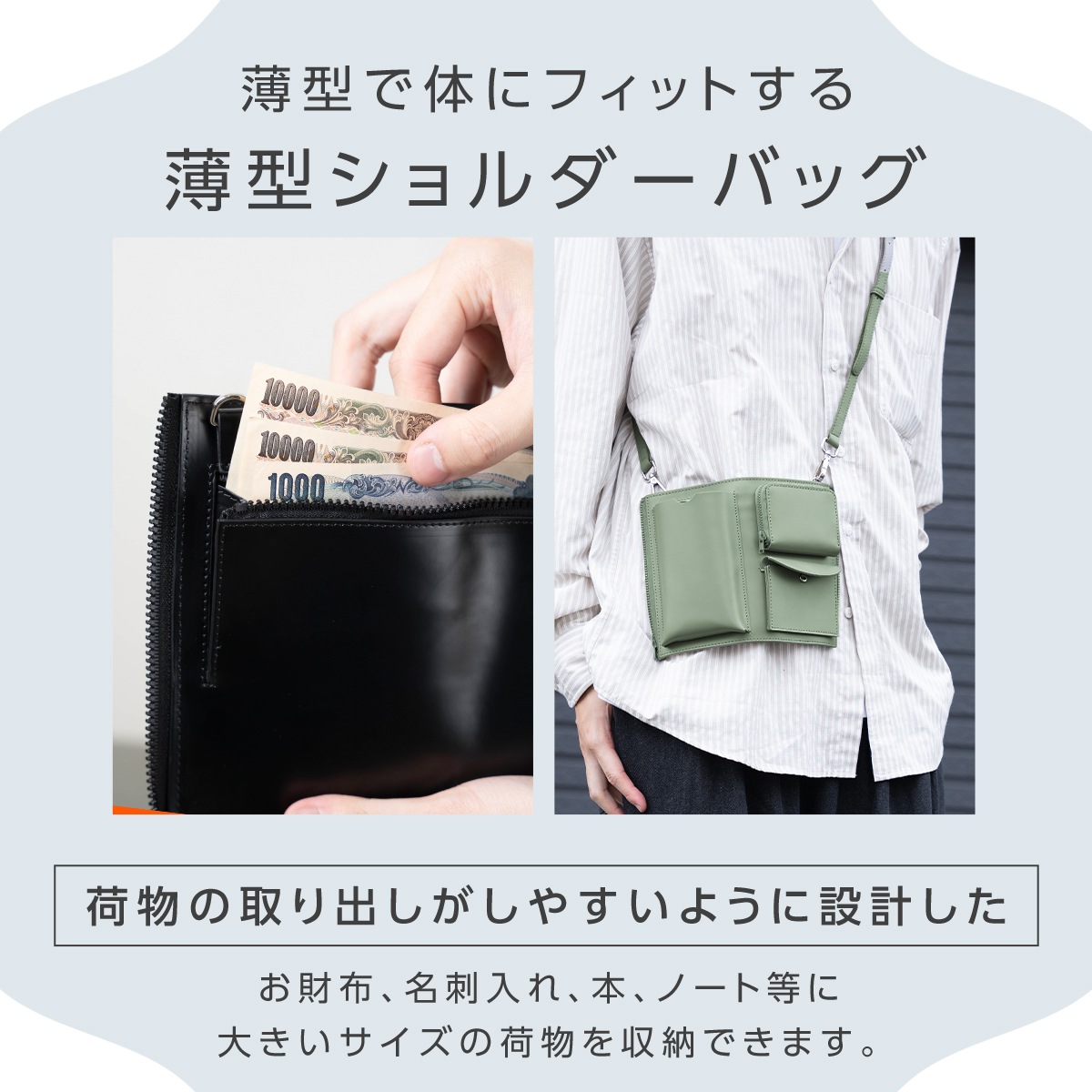 ・【薄型ショルダーバッグ】お財布、名刺入れ、本、ノート等に大きいサイズの荷物を収納できます。