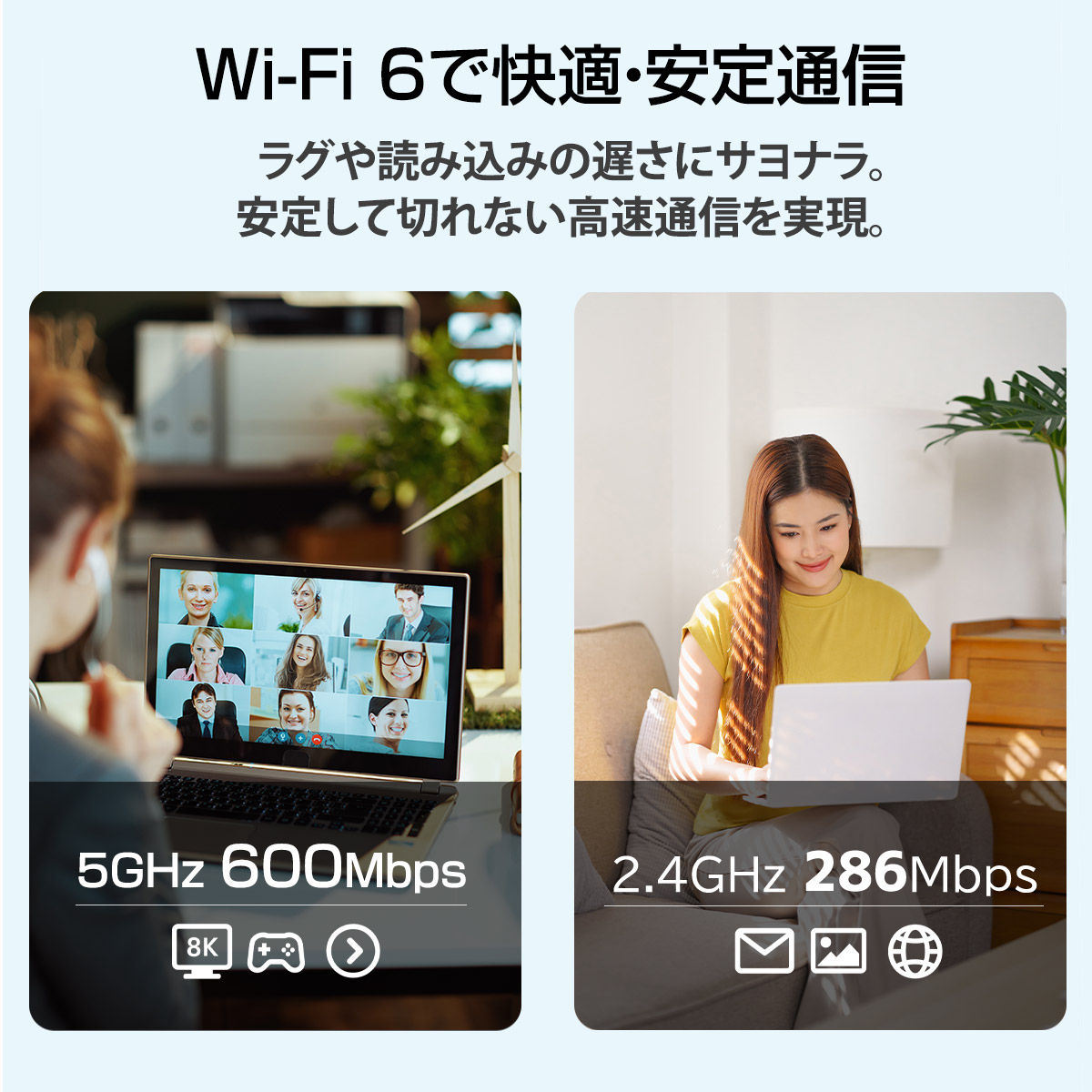 - ・【AX対応・Wi-Fi6搭載】次世代通信規格「Wi-Fi6(AX)」対応。5GHzで最大600Mbps、2.4GHzで最大286Mbpsの高速通信を実現。