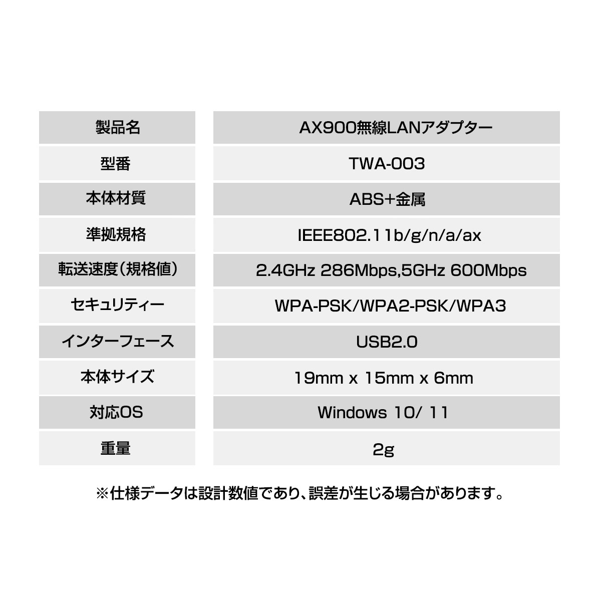 商品名称 AX900無線LANアダプター ブランド TOKAIZ 型番 TWA-003 商品詳細 準拠規格:IEEE802.11b/g/n/a/ax
