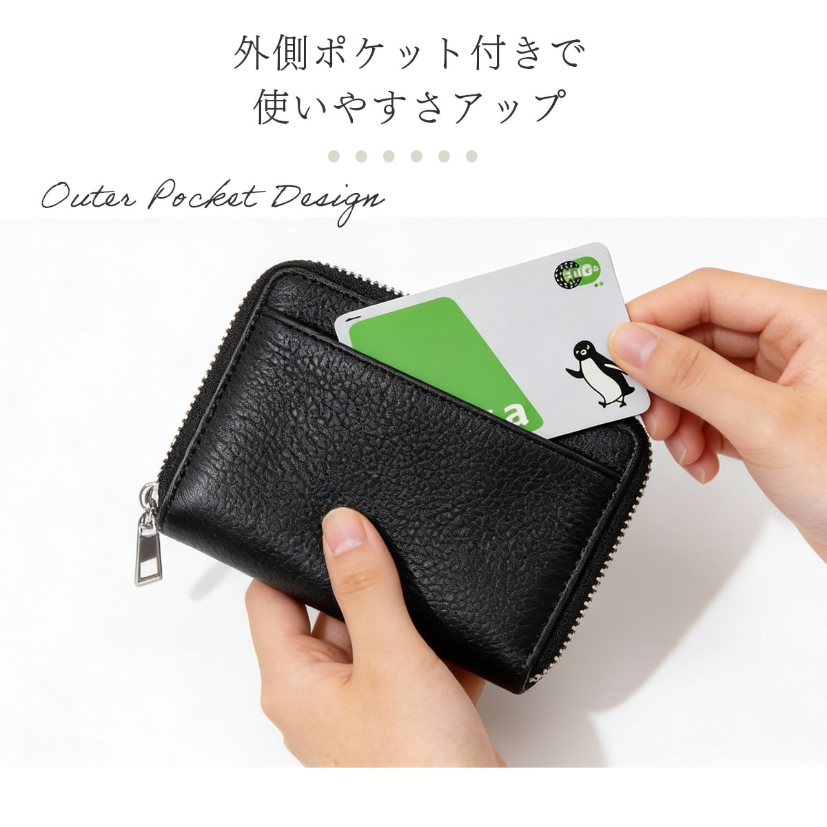 ・【外側ポケット】交通 IC カードや切符など頻繁に使うものを素早く収納可能で、使い勝手が向上する。