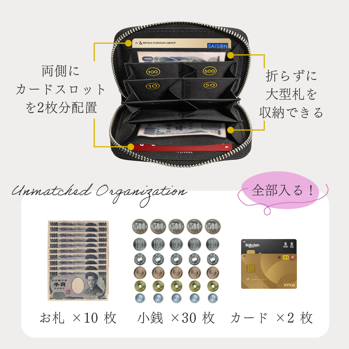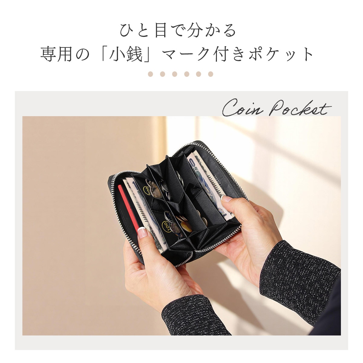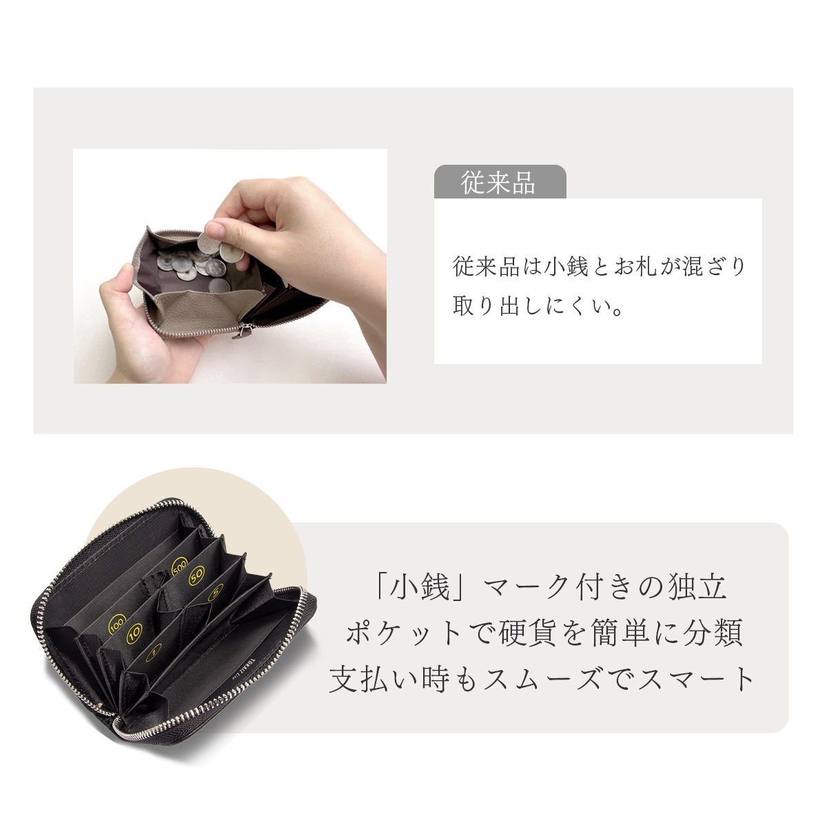 - ・【専用の「小銭」マーク付きポケット】小銭収納スペースを瞬時に見つけられ、使いやすさ UP!じゃばら式の大きな開きでカードの探し / 取り出しが容易。