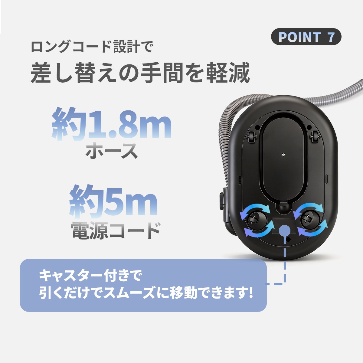 ・【大容量1.8Lタンク】給水の手間を減らす大容量設計。キャスター付きなので、重さを感じずスムーズに移動しながら掃除可能です。